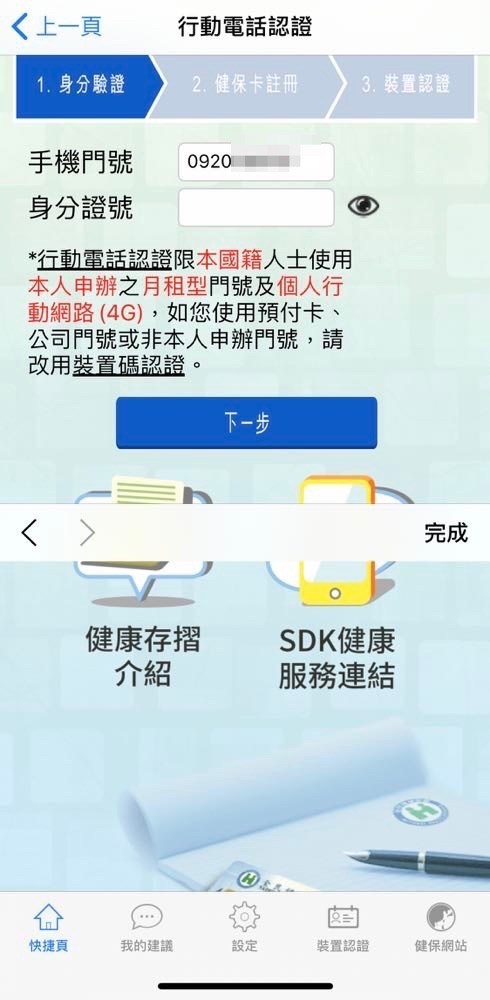 2) 選擇「裝置認證」>>> 「行動電話」認證,完成後就能在首頁登入「健康存摺」後預約,不過這項服務要在 3 月 12 日才會開放!