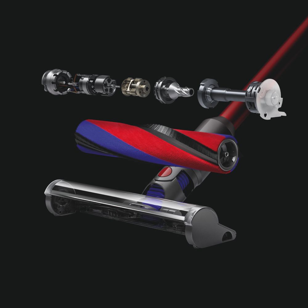 Dyson V8 Slim Fluffy+ 無線吸塵器為戴森五年以來首次重新設計軟質碳纖維滾筒吸頭,採用航空級輕質鋁材料,全新吸頭刷條直徑也比上一代縮短 29%。戴森工程師縫合毛刷中的防靜電碳纖維和毛氈,並更換先前使用的塑膠零件與黏著劑,進一步減輕吸頭重量。而戴森 V8 數位馬達運轉所需電量更低,也讓其他零件,例如:刷條內置馬達等,能同步實現輕量化的可能。