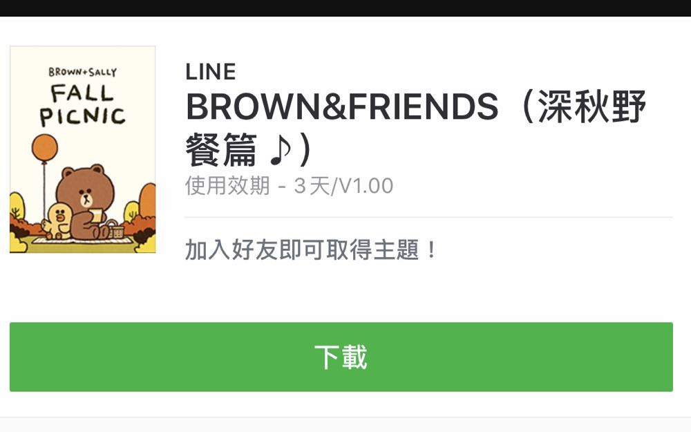 LINE 限時免費主題:BROWN&FRIENDS(深秋野餐篇♪)