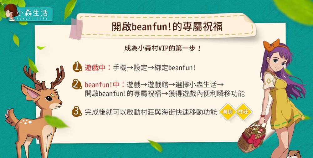 活動內容:開啟 beanfun!的專屬祝福可享有海街、村莊快速移動功能,成為小森村 VIP 的第一步,馬上綁定 beanfun!獲得好便利的瞬移功能吧!