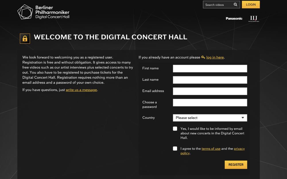 1) 在 2020 年 3 月 31 日前登入「柏林愛樂的數位音樂廳網站」申請帳號密碼