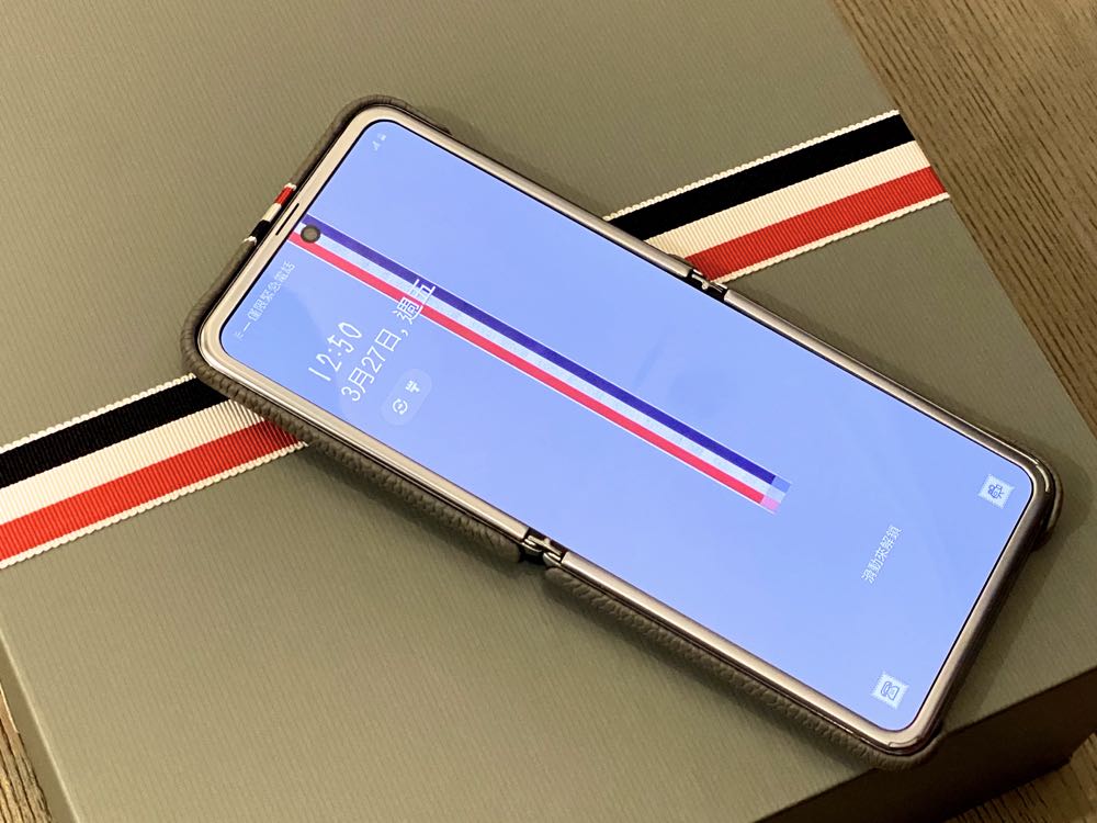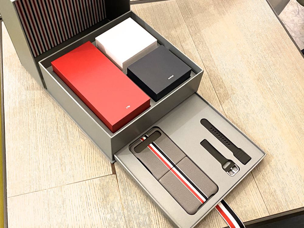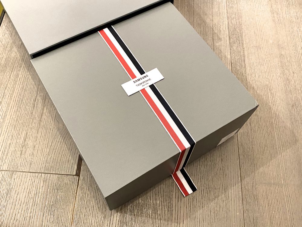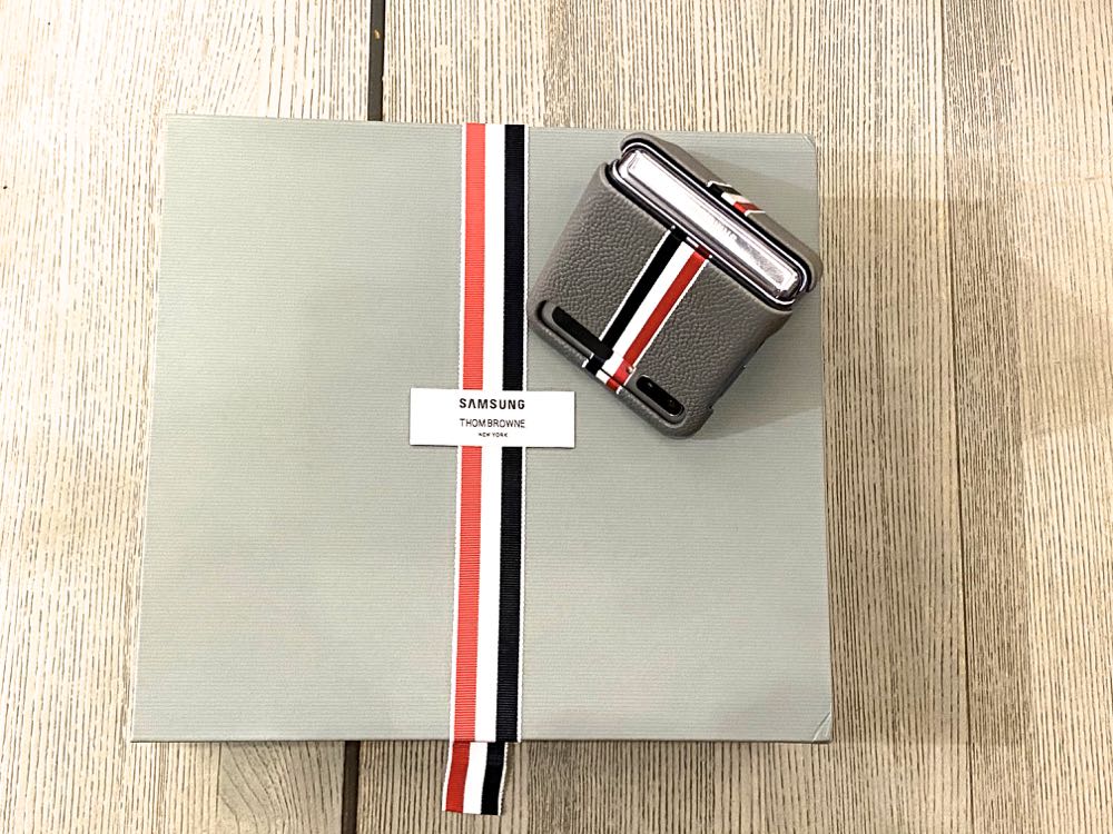 Galaxy Z Flip Thom Browne 版本的外盒有著 Thom Browne 的招牌淺灰色系,再加上紅、白、藍三色條紋以及 Samsung logo 從中間完美的呈現 crossover。