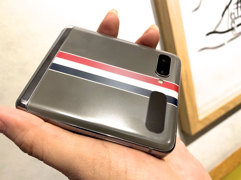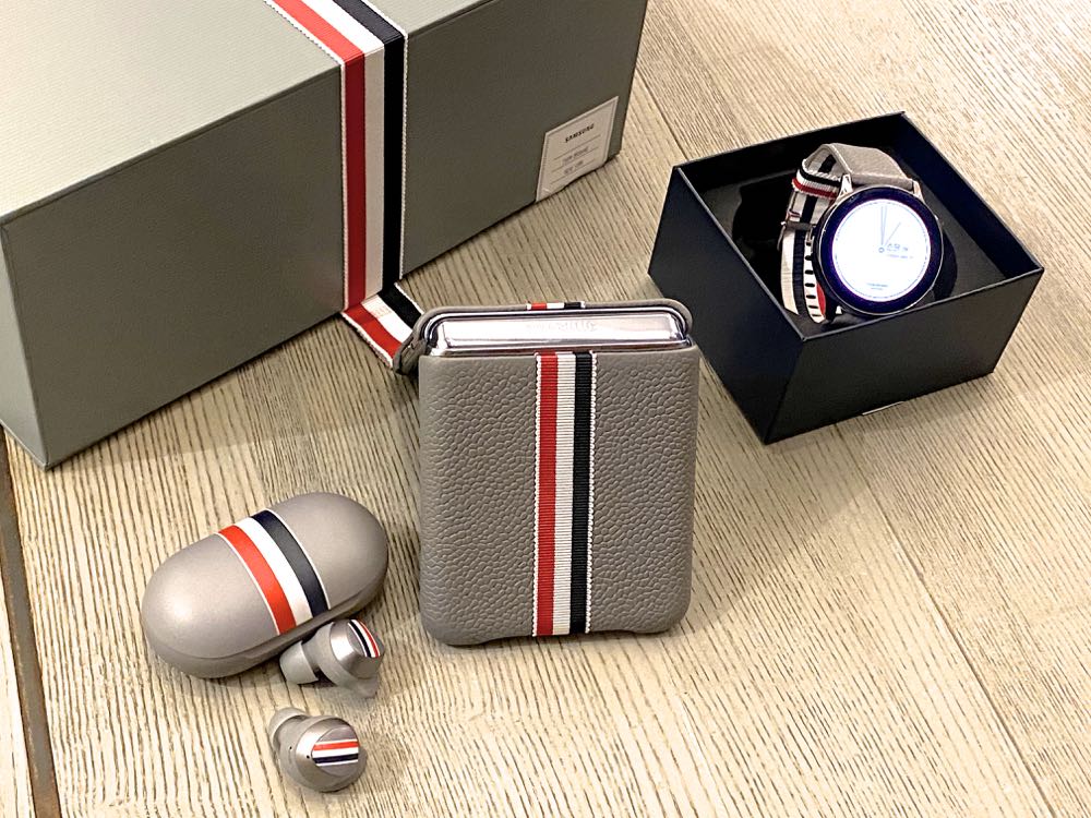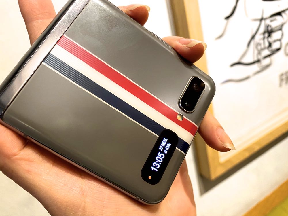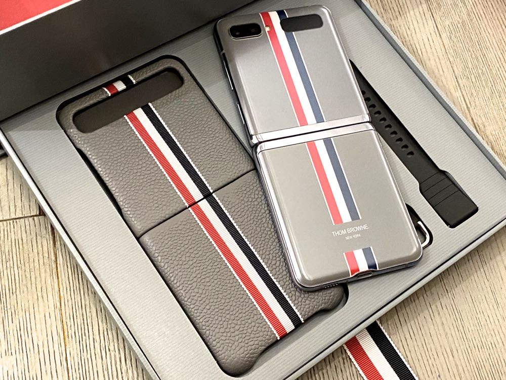 灰色系的 Thom Browne 西服,化身 Galaxy Z Flip 的時尚外殼,該款限量版的智慧型手機,具有全球首款搭載磨砂霧面質感設計的玻璃機身,觸感舒適、易於握持,而灰色皮革手機殼設計則源自經典 Longwing 雕花鞋,中間則以 Thom Browne 最具代表的品牌色系作為裝飾。