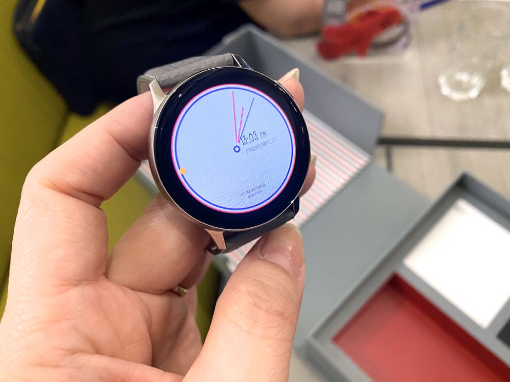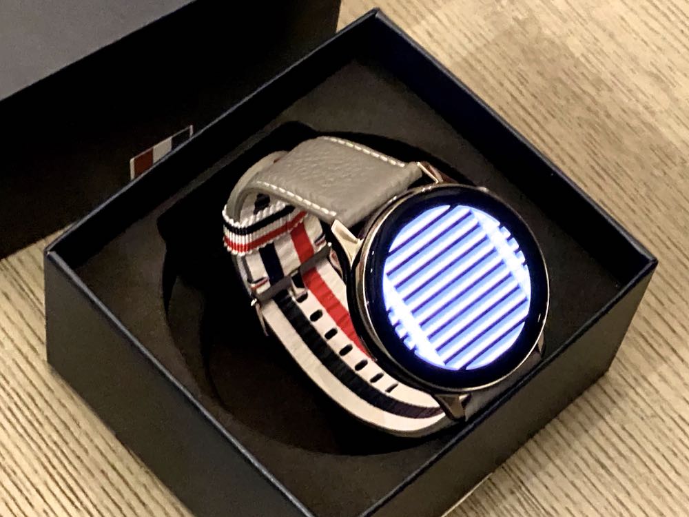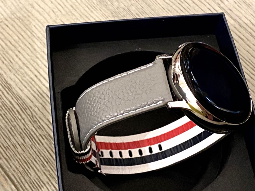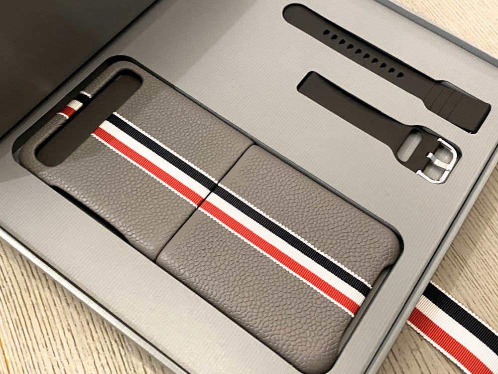除了 Galaxy Z Flip ,包裝盒中還有搭配灰色系皮革錶帶的 Galaxy Watch Active2。有著 Thom Browne 操刀設計的客製化錶面,讓使用者恣意以時尚品味,打造獨具的均衡生活。