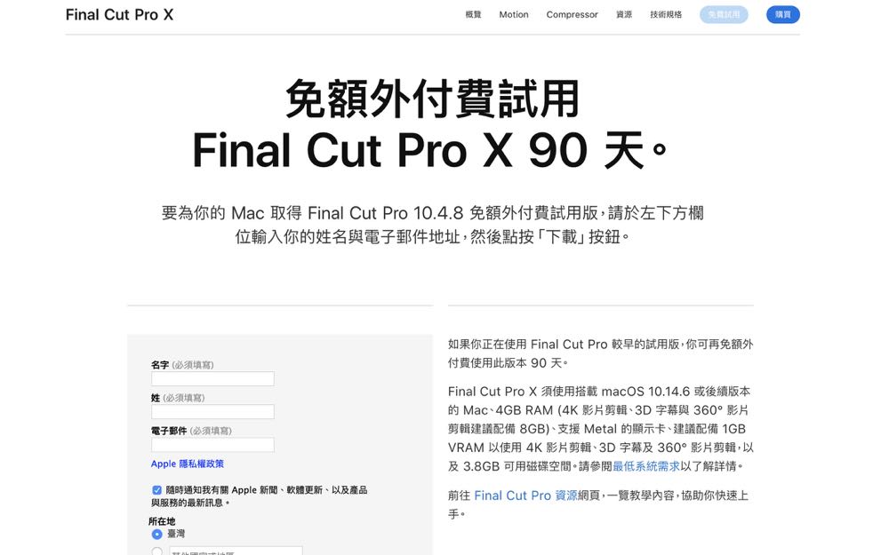 如果想要趁現在好好學一下 Final Cut Pro X 的朋友,只需在官網填寫姓名與電子郵件,然後按一下「下載」,就能為 Mac 取得 Final Cut Pro 10.4.8 的免費試用版囉!