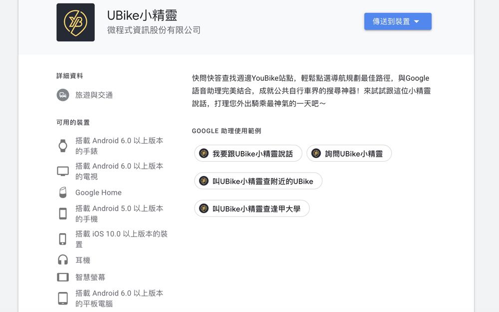然後我們就能對 Google 語音助理說出 「OK Google, 我要跟 UBike 小精靈說話」、「OK Google, 叫 UBike 小精靈查附近的微笑單車」、「OK Google, 叫 UBike 小精靈查逢甲大學」之類的指令。