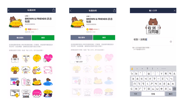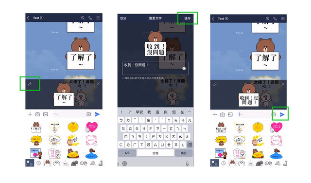 訊息貼圖除了字數多以外,最方便之處,在於每張貼圖都可預設不同的文字,雖說上限可以支援 100 個字,但 LINE 官方也建議最佳的閱讀效果會是在 20 字左右,用戶能在傳送前直接於聊天室內修改後儲存。