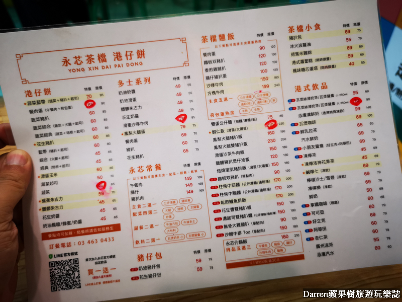 永芯菜單有港仔餅、多士系列、豬仔包、茶檔麵飯、港式飲品等,品項很多元可以從早餐、早午餐吃到下午茶點心