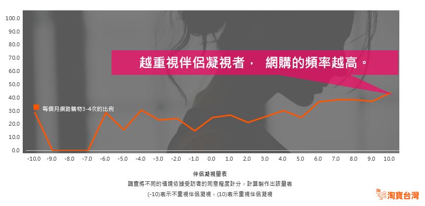 調查也發現,女性在網購選擇上更貼近感情狀態的起伏,感情觀念較開放者,偏好的網購品項也呈現不同的特徵,例如:心態上能接受婚外情的人,網購健身運動用品與寢具的比例偏高,且相對重視體態;而接受開放式關係或多元伴侶追求者,在網路上購買情趣用品比例也較高。