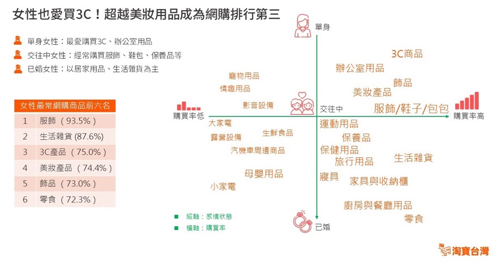 3月8日是屬於全球女性的節日,在網購日益普及的現代,淘寶台灣特別針對「女性情感與網購消費之心理互動」進行網路問卷調查 ,交叉分析後發現,女性消費者單月網購金額多為5000元以下的小額消費,而最常網購商品前五名分別為:服飾 (93.5%)、生活雜貨 (87.6%)、3C產品 (75%)、美妝產品 (74.4%)、飾品 (73%),其中單身女性偏好網購3C產品、辦公用品已超越美妝用品成為網購排行前三名。