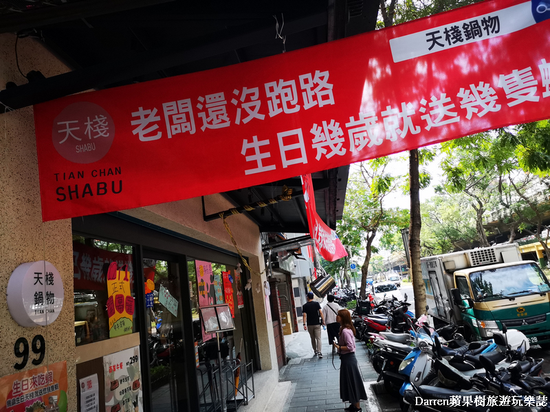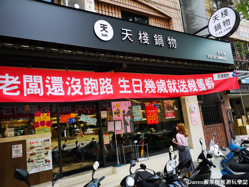 台北人氣火鍋店繼天棧鍋物天母店之後,來到中山區鄰近建國高架橋旁開了天棧鍋物民生店,餐廳門口就掛著老闆還沒有跑路,生日幾歲就送幾隻蝦的紅布條,網路聲量頗高的火鍋店,推出許多狂抽猛送優惠方案,除了霸氣送蝦以外,平假日4人以上生日餐打卡就有生日蛋糕,平日到民生店打卡按讚就送玫瑰長情美人蝦,優惠活動如果不吃蝦也能換成肉片,商業午間套餐也有加價活動,身為蝦控的樹小編二話不說立馬衝來吃一波