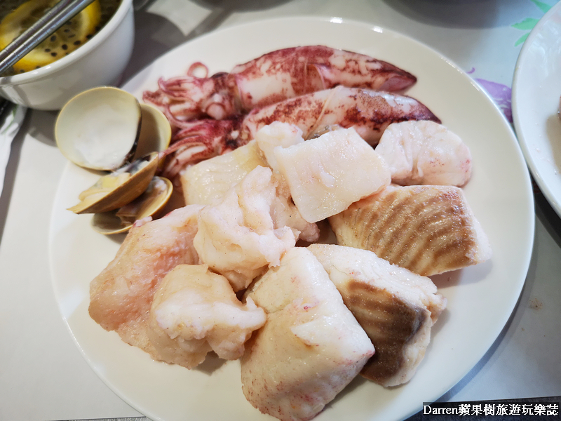 ▲海鮮盤有澎湖手打花枝蝦仁漿、鯛魚、巴沙魚、東北角小卷、南美白蝦、蛤蜊、東石鮮蚵等,雙人套餐看看內容再比對價格真得很划算