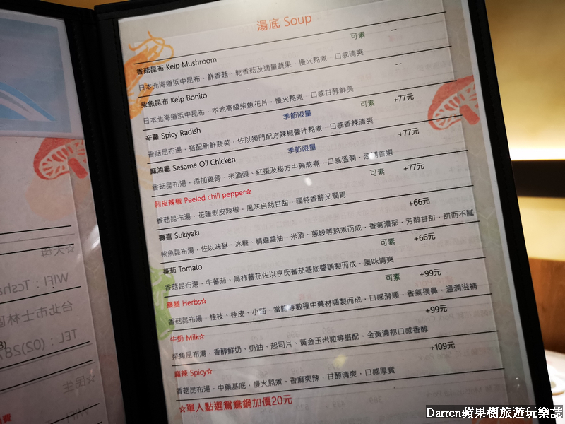 ▲湯頭基本有香菇昆布和柴魚昆布兩種可選,使用日本北海道昆布、鮮香菇、乾香菇以及蔬果下去熬煮而成升級湯頭從66到99元都有,有牛奶、麻油雞、泡菜、壽喜燒、味增、番茄、藥膳、剝皮辣椒等,我想今天以吃海鮮為主,所以選擇昆布鍋底,同行朋友吃肉有選擇牛奶和麻油雞鍋底