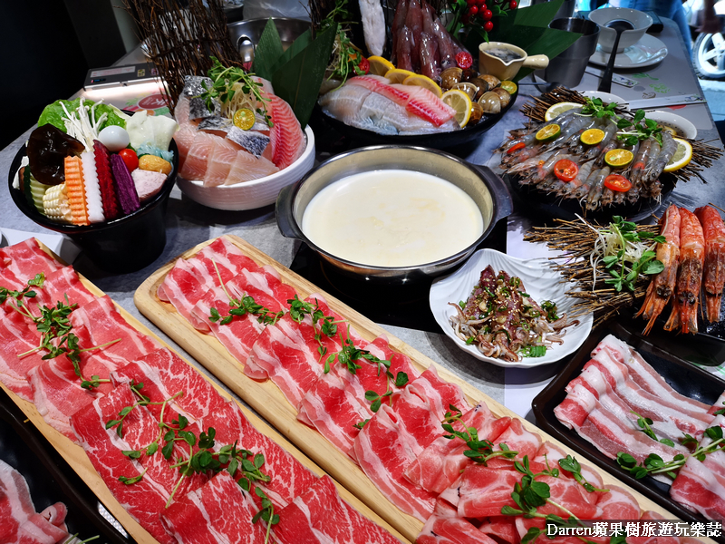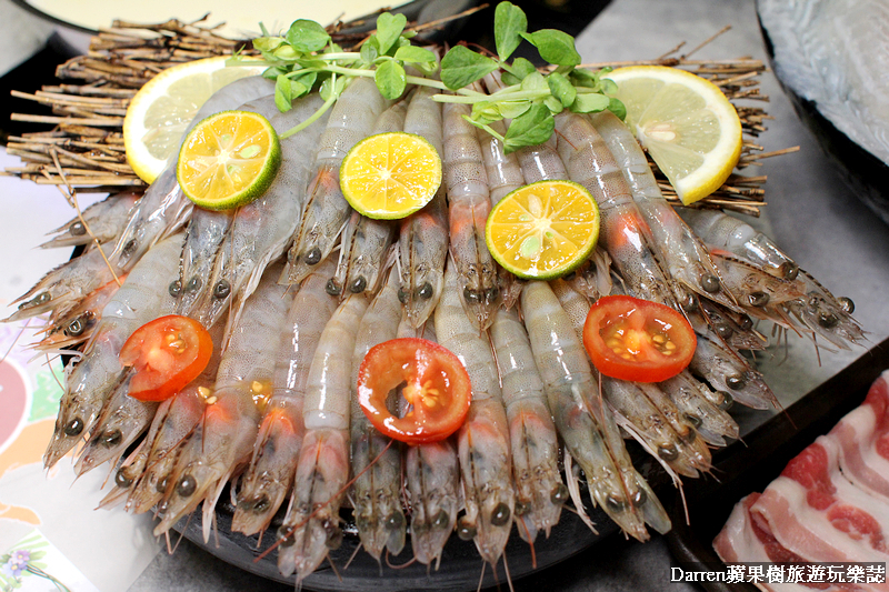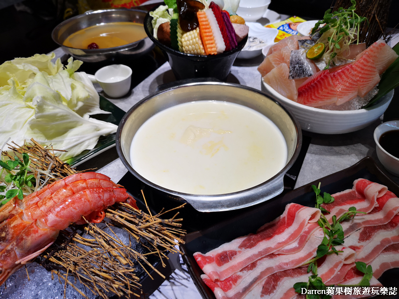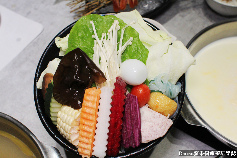 ▲基本菜盤裡有山藥、金針菇、大黃瓜、玉米筍、鮮香菇、凍豆腐、香菇、南瓜、紅蘿蔔、高麗菜等,以蔬菜為主色彩很繽紛,如果不想要吃菜盤也可以換肉盤或海鮮盤真的很大心,這可讓不少肉控或海鮮控都嗨翻了!!換成肉盤可以選擇有肥牛五花、活菌梅花豬、櫻桃鴨、雪花羊、咕咕G腿,換海鮮就有鯛魚、巴沙魚、天使紅蝦、小卷150g、白蝦6隻、草蝦3隻、蛤蜊8顆