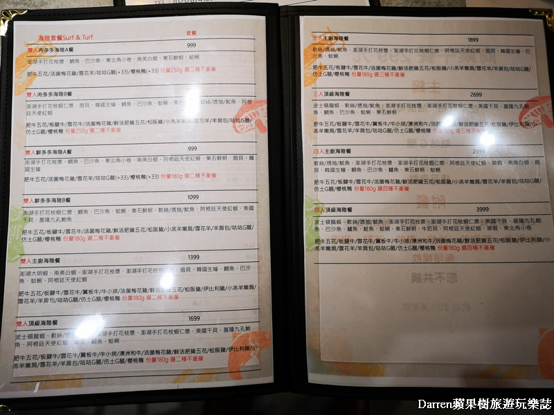 ▲▼套餐看要是要肉多多或是鮮多多,雙人肉多多海陸A餐,身為吃貨真得很難取捨,如果選擇肉多多,就會有一長串的肉浮誇登場,份量有250g,而且他們家的肉品也有一定的水準,也不會切薄薄都給的很大方