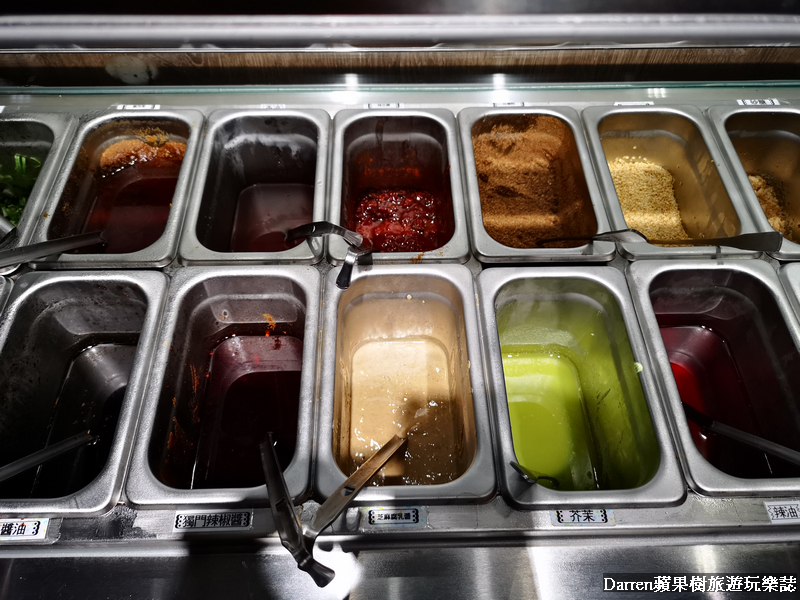 ▲▼自助吧的天棧鍋物醬料區,是天棧鍋物的特色之一,多達20種調味沾醬配料,讓吃火鍋多了許多口味上的變化天棧醬料大致上有沙茶醬、辣椒醬、醬油、蔥、蒜泥、柴魚醬油、醋、洋蔥、香油、柴魚醬油、蘿蔔泥、麻油、芝麻、腐乳醬、辣椒、花椒粉、雞心辣粉、辣油、芝麻、花椒粉、辣豆瓣醬等