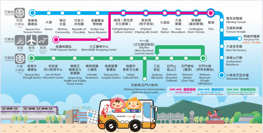 蛋寶生技不老村 → 三水茗園 → 福源茶廠 → 大平紅橋 → 三坑自然生態園區 → 中壢觀光夜市。
