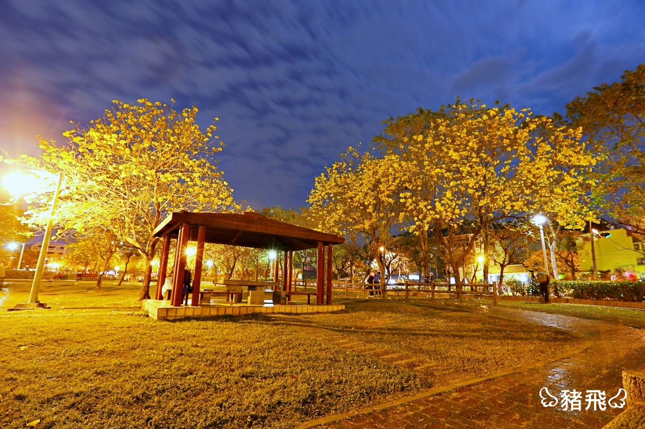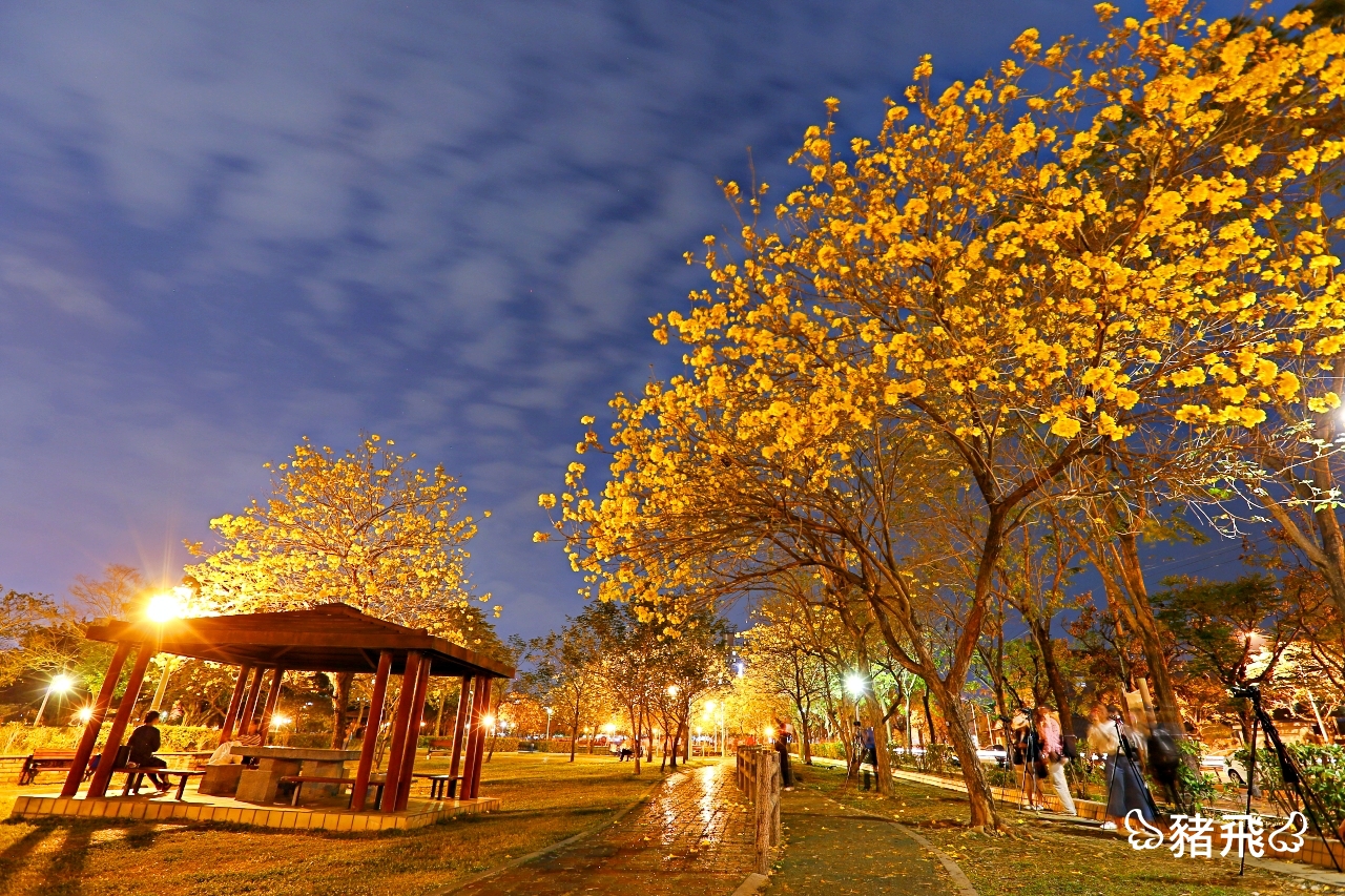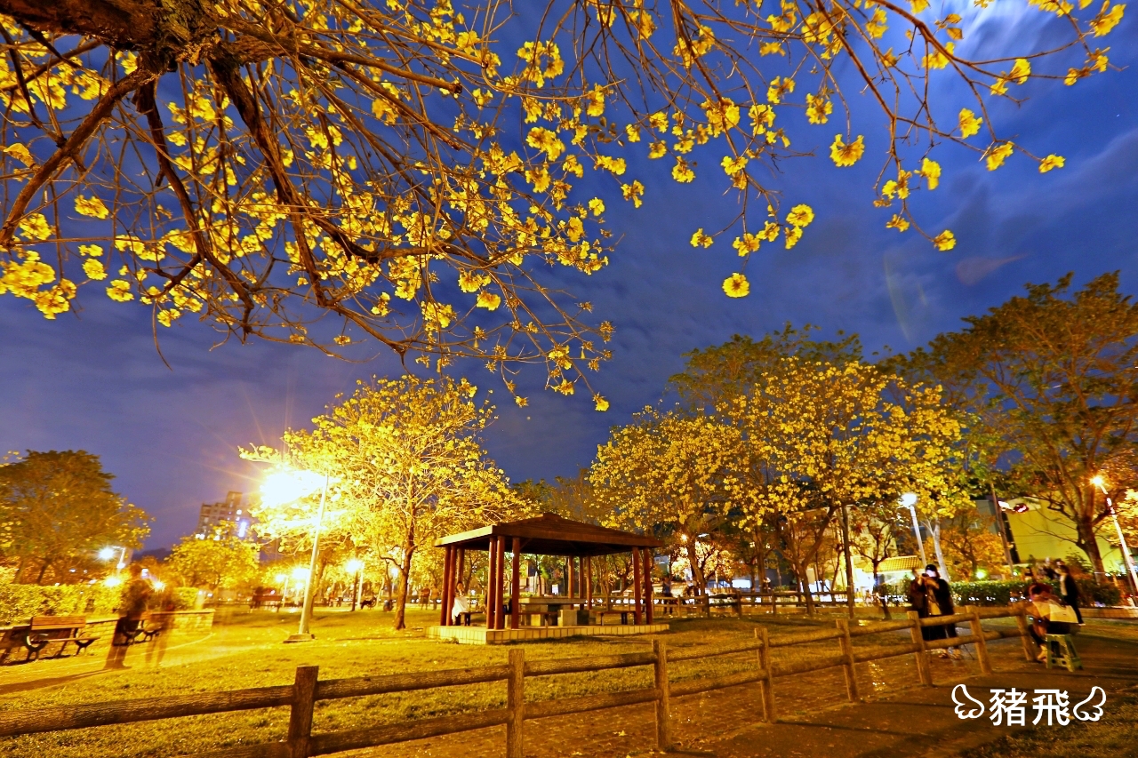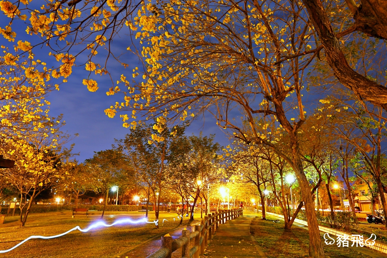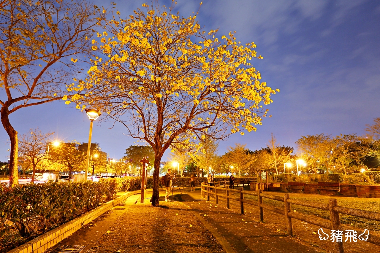 台中市區到北屯廍子公園大約半小時車程,從太順路、粉紅情人橋旁的景賢路,一路延伸到到廍子公園,超過將近百棵的黃花風鈴木爭相在三月初盛開,跟以往的兩年相比,大概是雨水較少,今年花開的特別茂盛,難怪不論白天或夜晚都吸引不少人前往拍照。