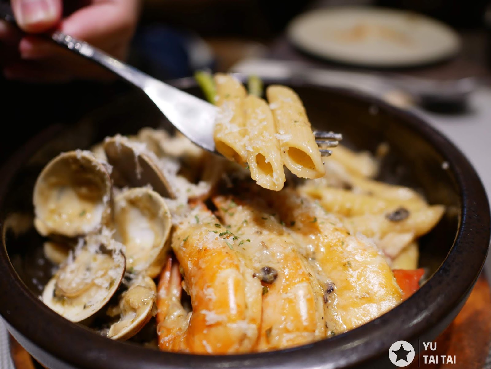 我點了「刺蔥烤羊肩」,原住民常用食材與小羊肩搭配起來相當和諧,不過,游先生抱持著「想看看這是啥鬼」心態而點的「剝皮辣椒海鮮義大利麵」,真是讓我們相當驚豔!怎麼想都不太對勁的組合,吃起來確實有種衝突感,但不得不承認……還真是好吃的噎?
