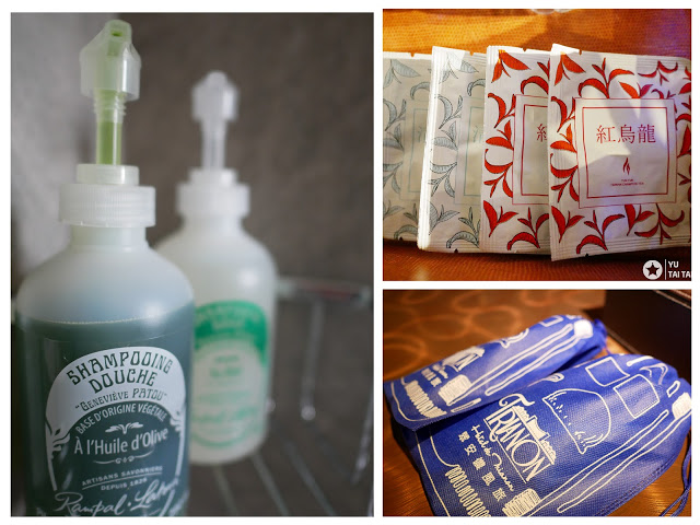 備品(法國南法香頌),台東當地小農的茶包,以及鼓勵大家整包帶走的備品包。
