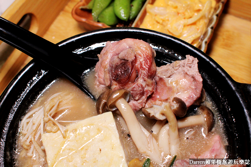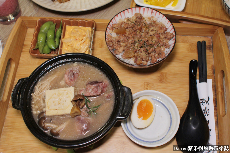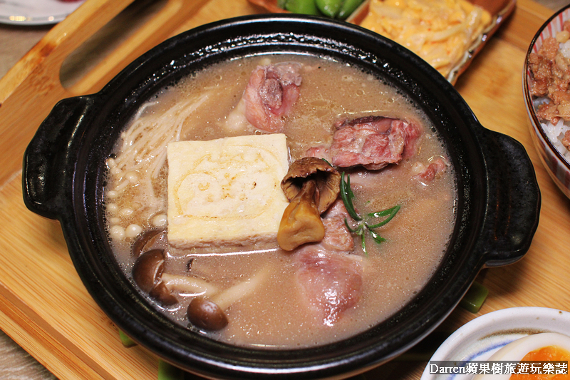 ▲▼巴西蘑菇力量雞湯定食,看起來不太起眼的蘑菇雞湯是用巴西蘑菇以及綜合菇類等熬煮超過4小時,湯頭喝起來濃醇旨口不會太油膩非常暖胃,雞湯內還有整支雞腿以及可愛的梨梨醬凍豆腐,配菜有溏心蛋和爽口的小菜,飯不是白飯也是這款定食的亮點,主廚家傳冬瓜肉燥飯,吃一口真得有嚇到我,真得好吃到亂七八糟,清爽不油膩入口又帶點清甜滋味非常棒