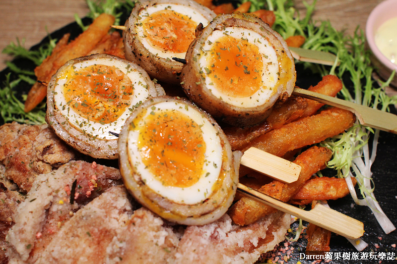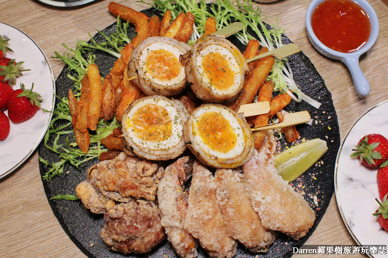 ▲▼好咖花漾綜合拼盤,來到好咖只要2人以上我都會點上一盤綜合拼盤,裡頭有薯條、唐揚雞、日式手羽先、溏心蛋豬肉串等,份量不少這樣只要299元超級佛,最特別的是他們家的溏心蛋豬肉串,豬肉片捲著溏心蛋,入口帶點膏狀的蛋香,以及微脆的肉片兩者一搭真得很無敵