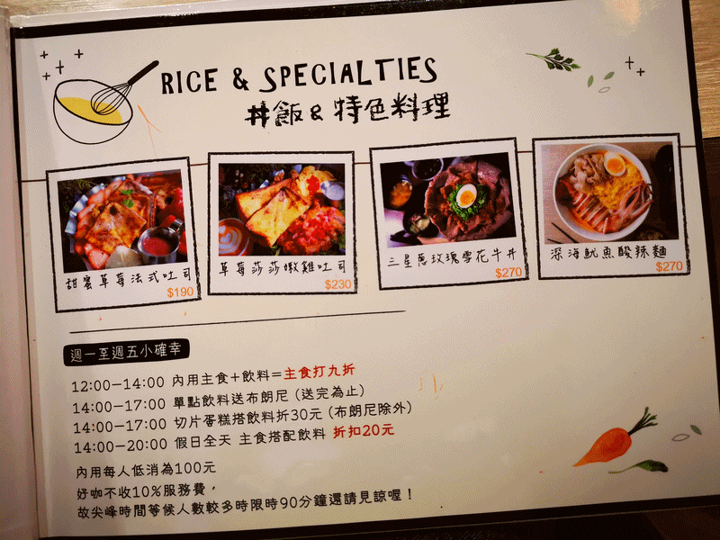 好咖菜單,內用每人低消100元不收服務費,人數較多用餐限時90分鐘,週一到週五有小確幸活動,餐點有丼飯&特色料理、期間限定隱藏版、咖哩飯、開胃點心、歐蕾、水果茶、果汁和甜點,好咖甜點蛋糕以現場櫃台旁冷藏櫃為主