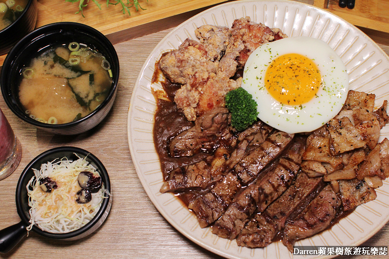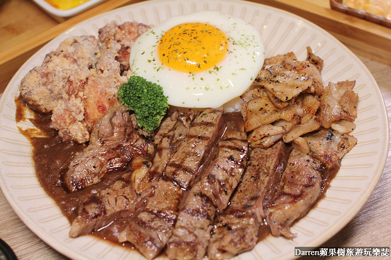 ▲▼無限咖哩(雨天限定),來好咖的這天剛好下著小雨,看到好咖菜單上面有雨天限定,也算是可遇不可求就毫不考慮點下去,無限咖哩總共有3種肉類沙朗牛排、雞肉唐揚、炙燒豬五花,還有一顆太陽蛋,端上桌感覺就是滿滿的肉盤,完全看不到飯在哪裡XD,整個無極限非常邪惡,3種肉大大滿足肉控們的需求,搭配香噴噴的咖哩,白飯和咖哩又可以再續,對於飄著小雨有點冷的天氣,也算是冬天裡的一把火,讓大家補充元氣非常佛