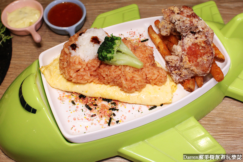 ▲好咖小朋友特餐,飛機造型餐盒,裡頭有炸雞和薯條,以及蕃茄炒飯和起司蛋,底下的起司蛋很好吃,連大人都會想要搶著吃的呈度