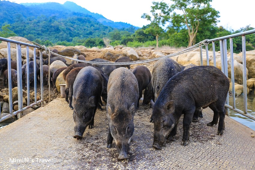 島上有很多無人豢養的野生山豬,當遊艇將靠岸時,船長突然開始播放音樂,多達20、30隻的山豬就這樣跑到岸邊來迎接大家。後來才知道這些野生山豬已經被制約,聽到音樂就自動下山迎接食物,導覽人員會拿出燕麥片給大家餵食,整個氣氛超歡樂的,近距離看山豬其實人家也是滿可愛的嘛