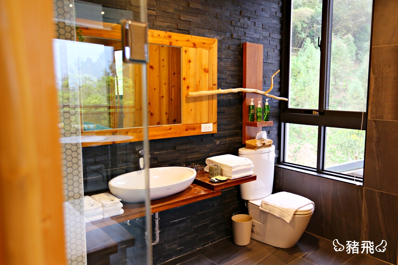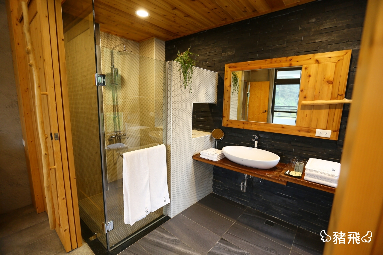 很喜歡房間裡浴室一角,透明玻璃門的淋浴間、木製洗手臺、木製鏡框、岩質牆面實在像極了在森林裡面沐浴一樣,連浴室也設計美美的。