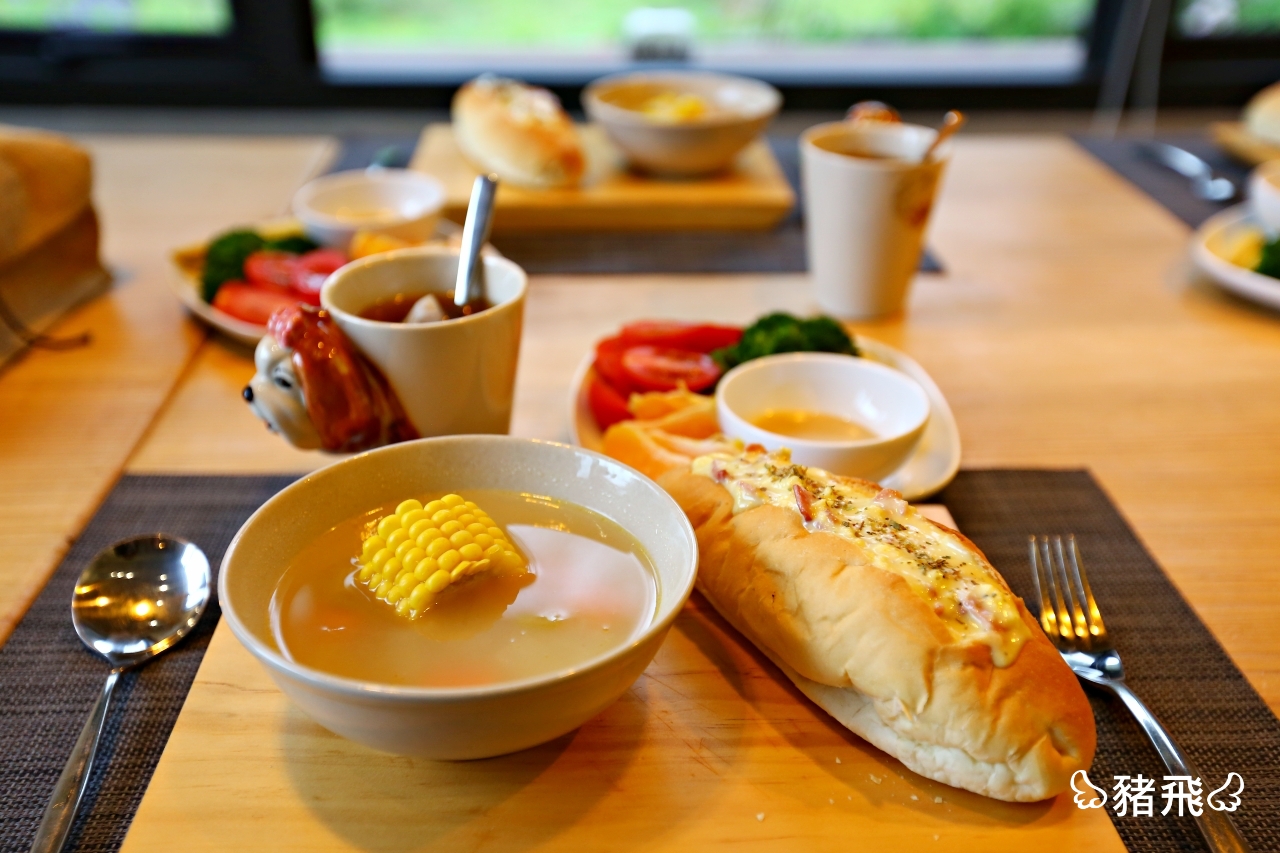早餐是民宿主人自己下廚的健康餐點,配色很開胃,柑桔、小番茄、綠花椰菜、蔬菜湯跟超好吃潛艇堡。這個潛艇堡中間夾入希臘優格醬和蛋液、奶油,有玉米粒、培根、蘑菇,吃完一份直接飽到晚上了。