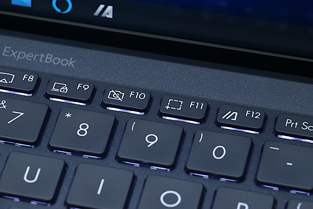 F9~F12 是 ExpertBook B9 (B9450) 系統與硬體專屬的快捷功能,由左至右分別是系統上鎖、開 / 關鏡頭、螢幕截圖以及 MyASUS 服務。
