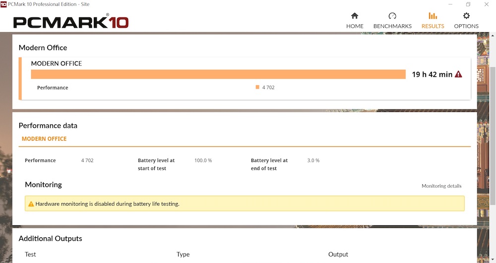 續航力方面,我們在平衡電源管理模式、螢幕亮度設為 50%、開啟 Wi-Fi,並且關閉藍牙、定位、鍵盤背光與虛擬數字觸控板的條件下,使用 PCMark 10 MODERN OFFICE 模式來做測試,測得的時間是 19 小時 42 分鐘,成績則是 4,702 分,與官方公布的 20 小時工作時間相當接近,證實了 ExpertBook B9 (B9450) 即使在不接電源的情況下,能提供非常持久的續航力,讓經常在外辦公的商務人士可以安心使用。
