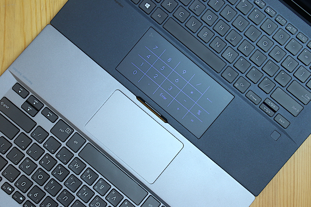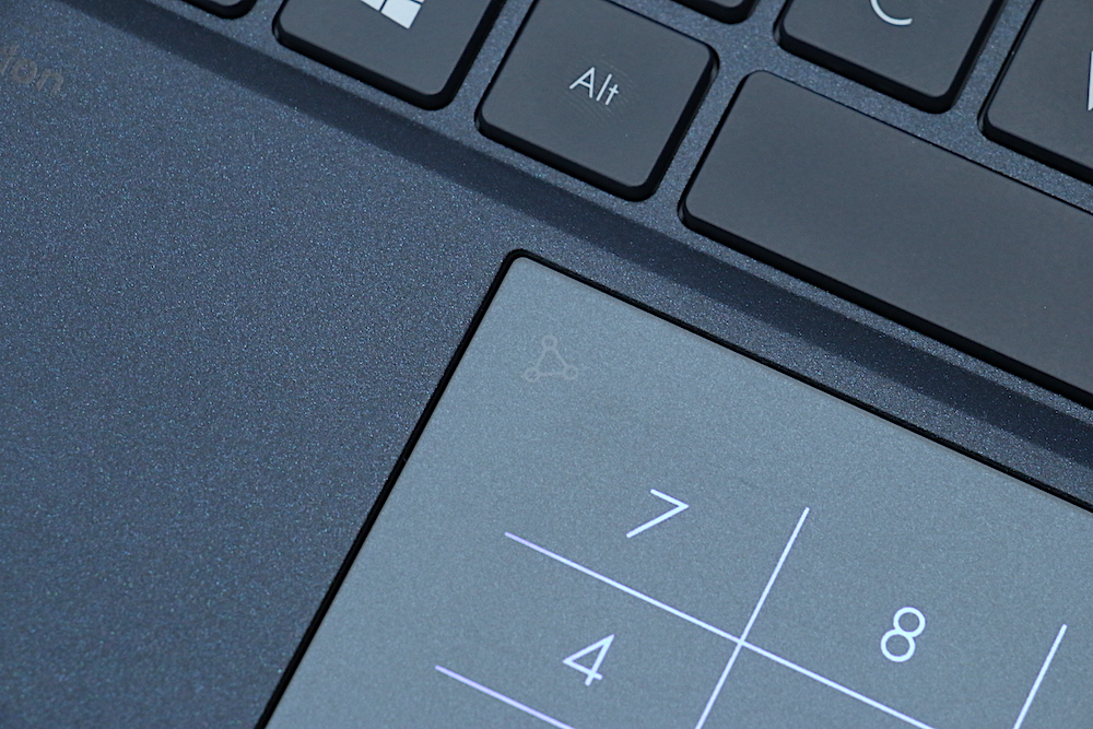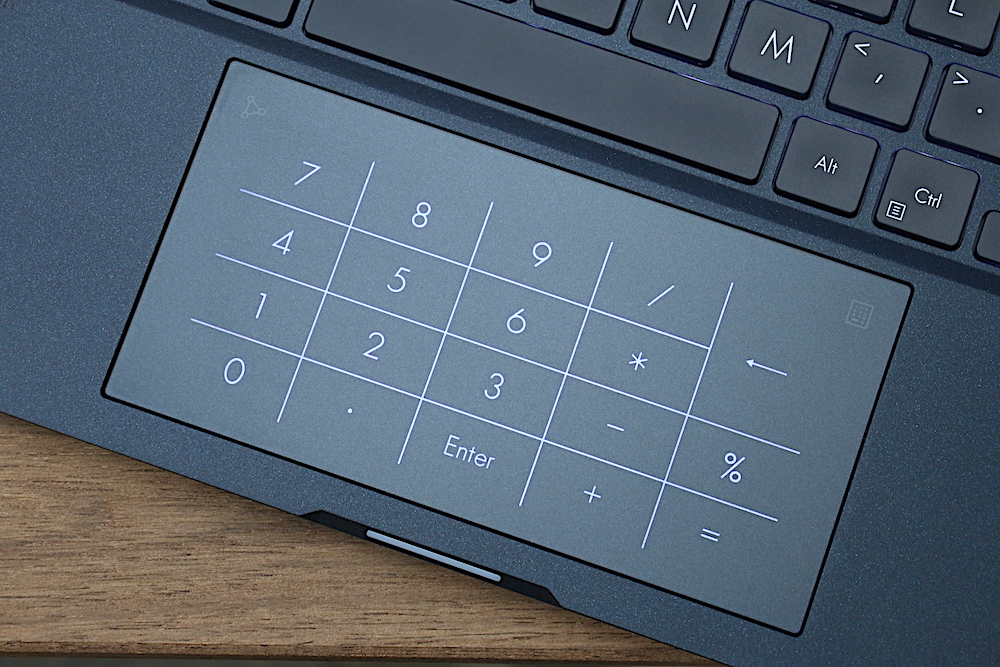 虛擬數字觸控板設置在鍵盤下方,只要長按右上角的數字鍵切換鍵,就能快速叫出數字鍵,輸入數字、密碼或計算時特別好用。