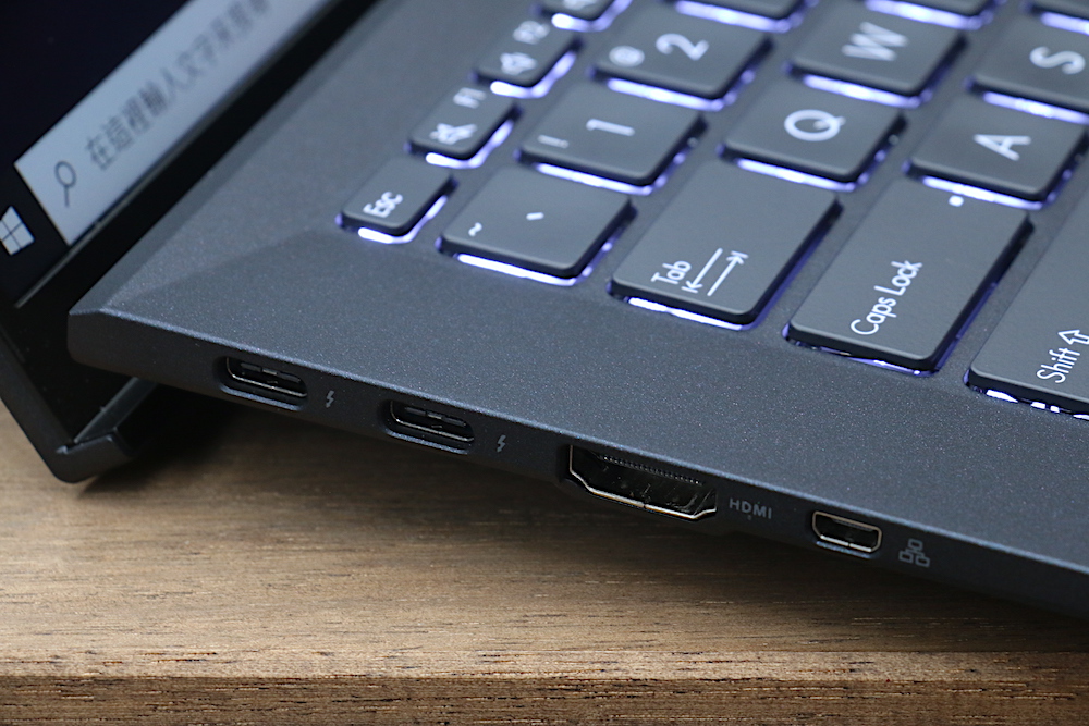 左側則是設置兩個支援快充或螢幕輸出的 USB Type-C (Thunderbolt 3) 連接埠、一個 HDMI,以及一個 micro HDMI 網路接孔。值得一提的是,ExpertBook B9 (B9450) 內建網路晶片,並支援固定 MAC 地址,可以透過 micro HDMI 來連線,有線網路的使用者也可以輕鬆使用。另外,ASUS 有針對經常插拔的連接埠,用螺絲與支架加強固定,提高連接埠的耐用度。