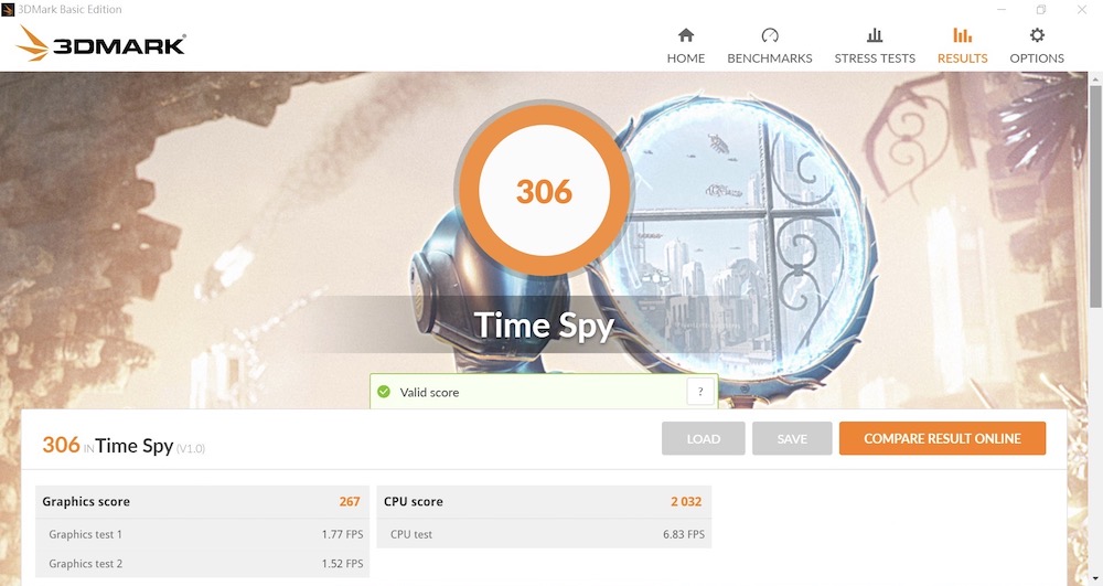 除了使用 PCMark 8 與 PCMark 10 MODERN OFFICE 模式來測試效能及電池續航力外,我們也利用 3DMark 來檢視一下內顯的效能表現。實測後所得到的分數為 306 分,效能表現較中規中矩,應付簡單的短片編修沒太大問題,不適合用來專業剪輯或玩高階遊戲。