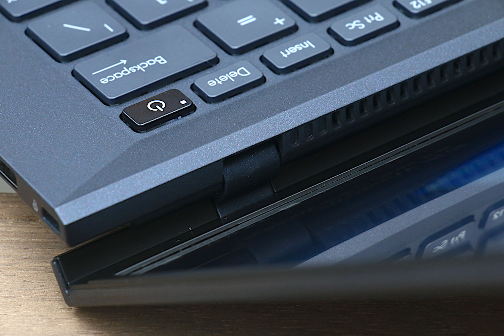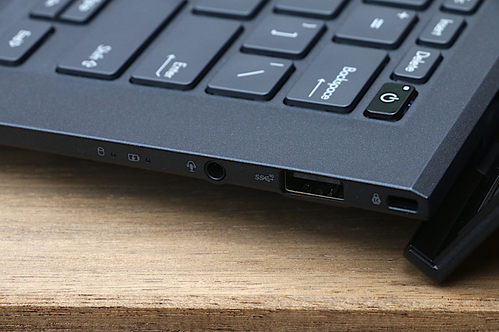 完整的 I / O 介面也是這台筆電的特色之一,機身右側設置了一個 3.5mm 的耳麥孔、USB Type-A 3.2 Gen 2 連接埠,以及一個防盜鎖孔。