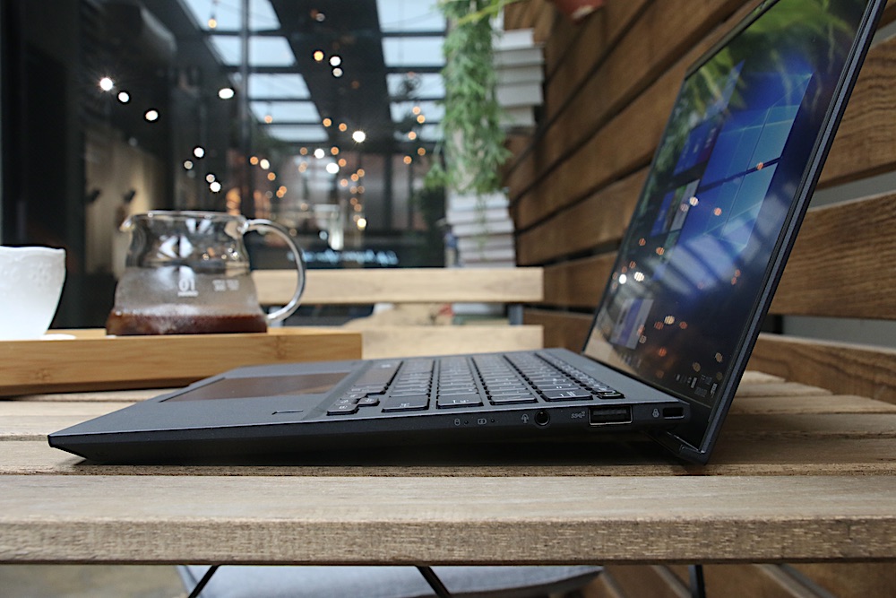 極窄邊框是這台筆電最大的特色之一,根據官方數據指出,左右兩側的邊框僅有 4mm,上面的邊框則是 7mm,這是它能輕鬆把 14 吋螢幕放入 13 吋機身中的最大關鍵。