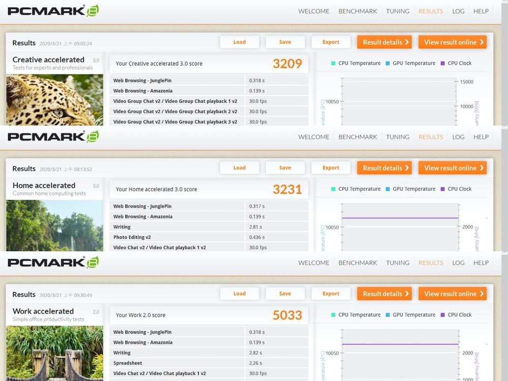 搭載第 10 代 Intel Core i7-10510U 處理器、16GB RAM 的 ASUS ExpertBook B9 (B9450),經 PCMark 8 跑分軟體實測,得到了相當出色的效能成績,Creative 項目拿到 3,209 分、Home 項目拿到了 3,231 分、Work 則是拿到 5,033 分,這樣的效能表現,能很輕鬆的面對基本的文書作業、照片編修,甚至是需求更高的多工作業。