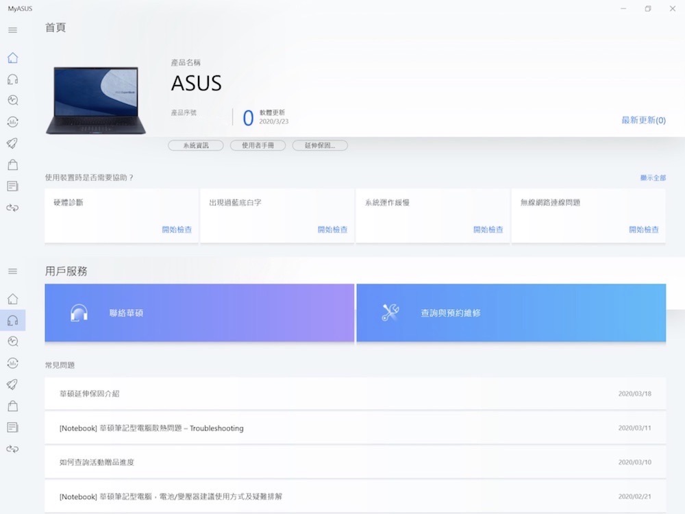 MyASUS 則是偏向用戶服務的功能,只要透過 F12 的快捷功能就能迅速啟動,進入頁面後即可檢視筆電的相關資訊,或是簡易的問題排除。此外,MyASUS 還提供基本的系統診斷、硬體設定服務,使用的過程中若遇到問題,或是想調整一下充電與風扇模式,也可以進來 MyASUS 裡面看看。