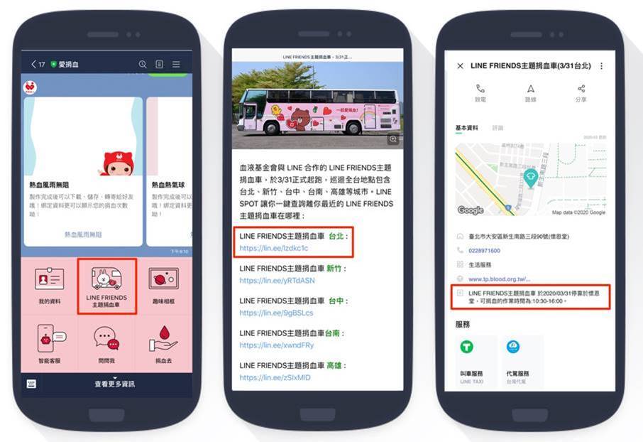「愛捐血」公益帳號為捐血者提供即時且兼具隱私保護的諮詢平台,迅速解決常見的捐血問題;客製化的功能也讓台灣血液基金會可以即時在全台需要募血的地點,募得需要的血型;這次雙方為「愛捐血」公益帳號串接了 LINE SPOT,讓捐血者可以根據所在位置尋找就近的捐血車(包括五台LINE FRIENDS 主題限定捐血車)與捐血定點,以舉手之勞隨時隨地捐出熱血。