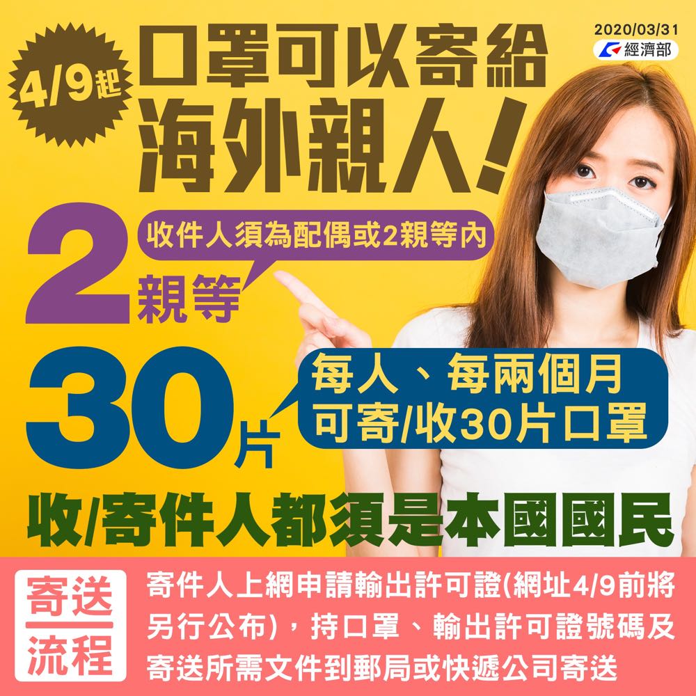 A7.目前規劃郵包免出口報關、快遞遞送得以簡易報單申報,由寄件人上網申請輸出許可證、民眾持口罩、輸出許可證號碼及寄送所需文件等到郵局或快遞公司寄送。經濟部會儘速公告詳細流程。