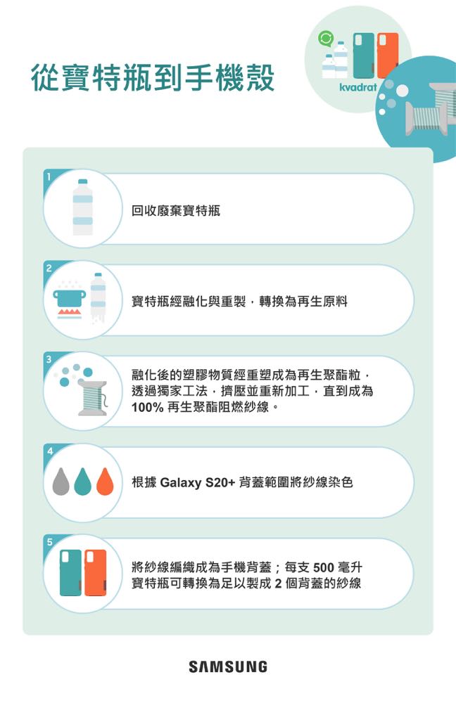 Galaxy S20+ 織布背蓋以 Kvadrat 織料製成,利用永續手法將廢棄寶特瓶升級再造,轉換為再生聚酯紗線,並加工成為時尚背蓋。再生紗線減少垃圾掩埋場中PET寶特瓶數量,對環境有所助益; 相較傳統生產過程,再生紗線的製造方式縮減二氧化碳排放量。而與普通聚酯生產方式相比,Kvadrat 再生紗線的製作手法降低能源消耗,節省珍貴石油資源。