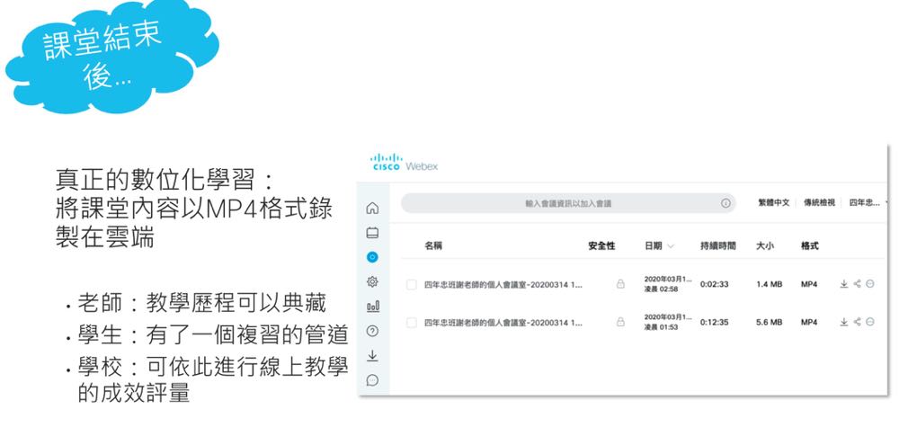 思科 Webex 提供了真正數位化學習,將課堂內容以 MP4 格式錄製放在雲端,影像的錄音檔案可以提供學生們複