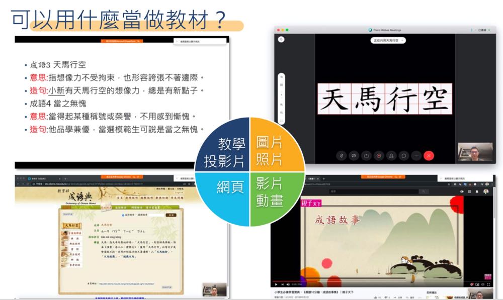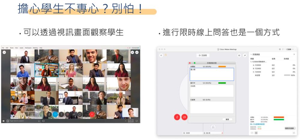 思科 Webex 適用於不同行動載具。師生可以直接打開電子課表(行事曆),然後按「加入會議」進入課堂。用戶可以透過 Webex 進行互動教學,例如展示投影片、網頁、影片、圖片,以及使用白板功能等等,讓學生們可以像是置身於教室中學習。還能進行秩序管理,像是畫面觀察、舉手發問、即時投票及靜音控制,確保了上課品質不受干擾。
