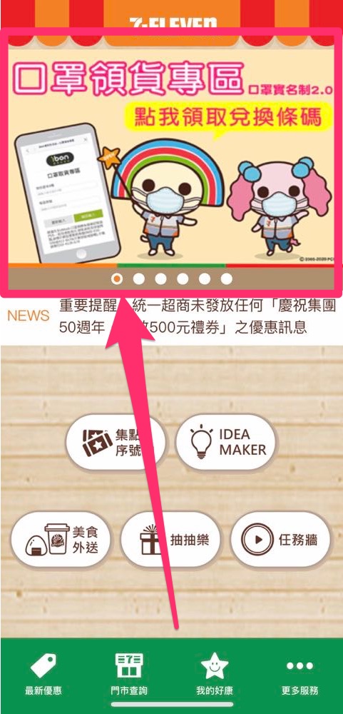 7-11 在 9 日早上也為 app 進行更新,將領取口罩的頁面放在 7-11 app 首頁上。同樣是輸入身分證後四碼與領取序號就能夠領取兌換條碼。