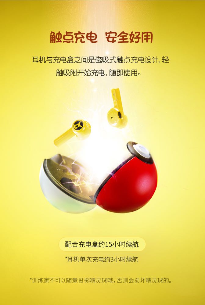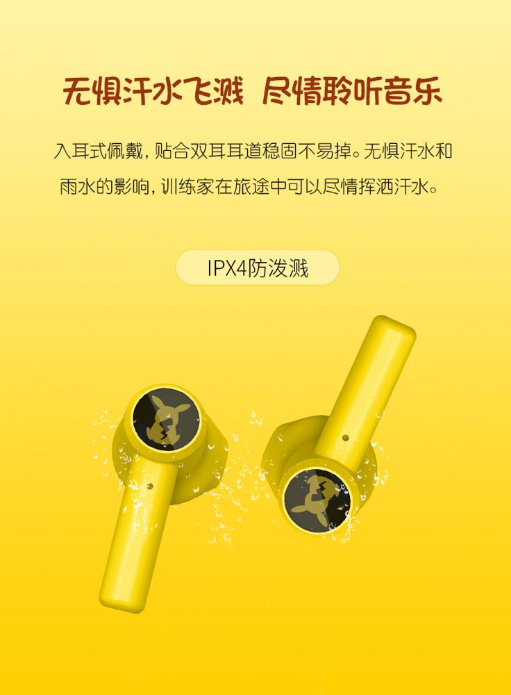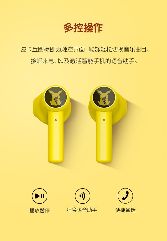 耳機本身不只有著皮卡丘的招牌黃色,也提供 13mm 的驅動單體,能夠提供清晰、平衡的音效以及低沉的低音、IPX4 的防潑水等級,還有藍牙 5.0 與自動配對的功能、觸控語音助手