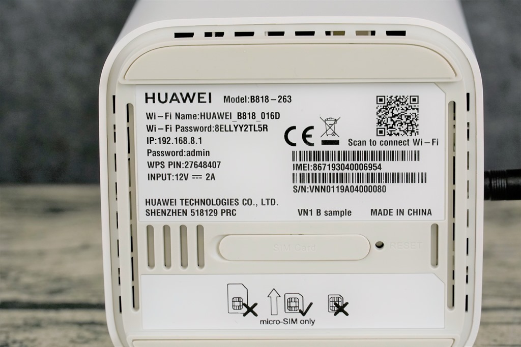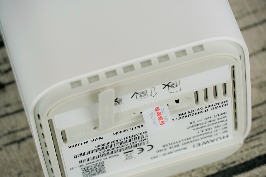 背後除了上方的電源鍵外,下方有著兩個 RJ-45 網路孔與電話孔,很多 4G 路由器在網路孔部分都採用 100Mbps 的 Fast Ethernet 規格,其實以遠傳的網速來說,只要地點允許,要超過 100 Mbps 根本就易如反掌,但如果用一般規格就浪費了這麼快的網路。所以遠傳才特別採用 HUAWEI B818-263 無線路由器作為方案搭配,因為他的網路孔最快可以支援到 1000Mbps 的 Gigabit Ethernet 網路孔,這樣就不會浪費了遠傳 4.5G 的高速網路。