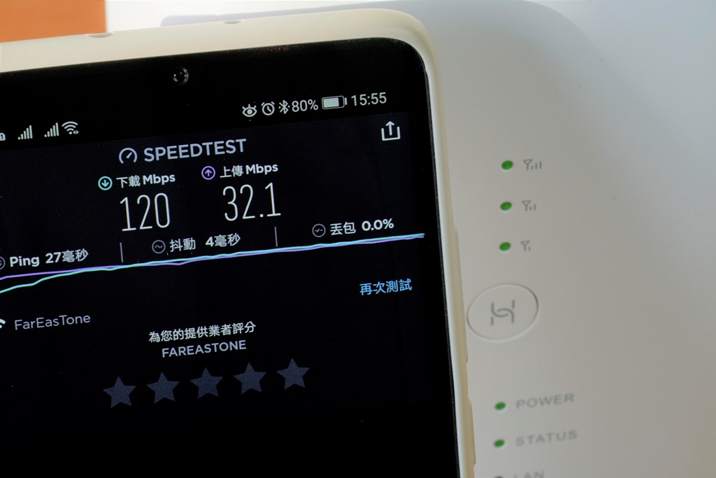 接著插上電源線並將手機連上路由器再測一次,速度來到下載 120.0Mbps、上傳為 32.1Mbps,會有這樣差距的主要原因是,路由器上因為體積較沒有限制,所以自然可設計訊號接收能力較強的天線,在網速上自然就較手機來的快一點。所以這當然比你用手機作為分享器要來的優異,而且可連接智慧裝置數量更多,當然也可讓家中智慧連網裝置可以更發揮不在家也能知道家中大小事的功能。